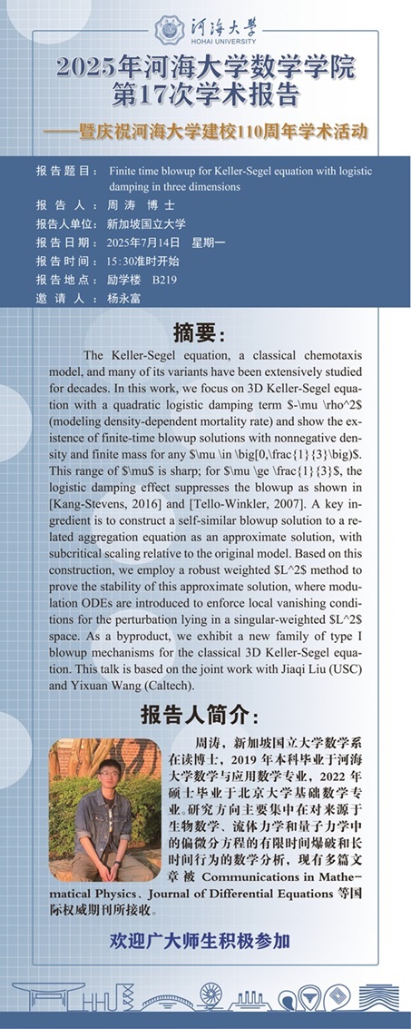 77779193永利集团第17次学术报告:Finite time blowup for Keller-Segel equation with logistic damping in three dimensions