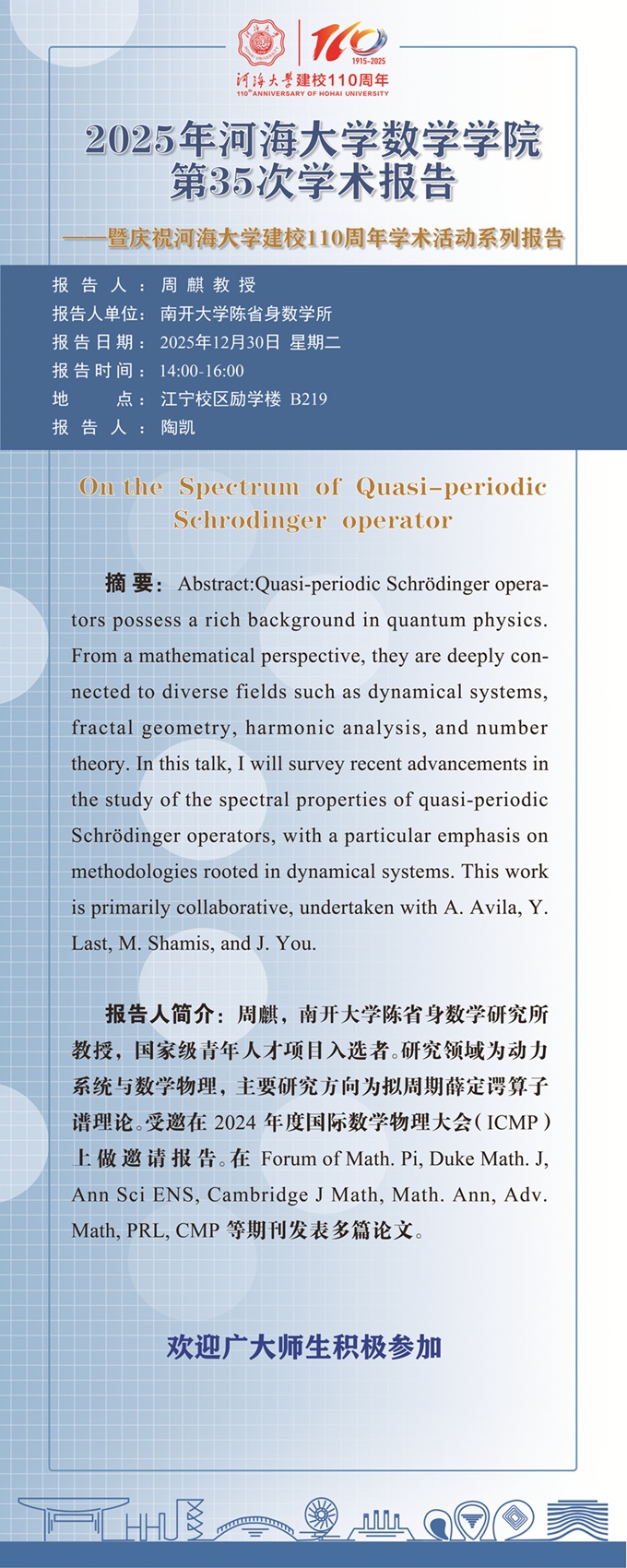 77779193永利集团第35次学术报告:On the Spectrum of Quasi-periodic Schrodinger operator
