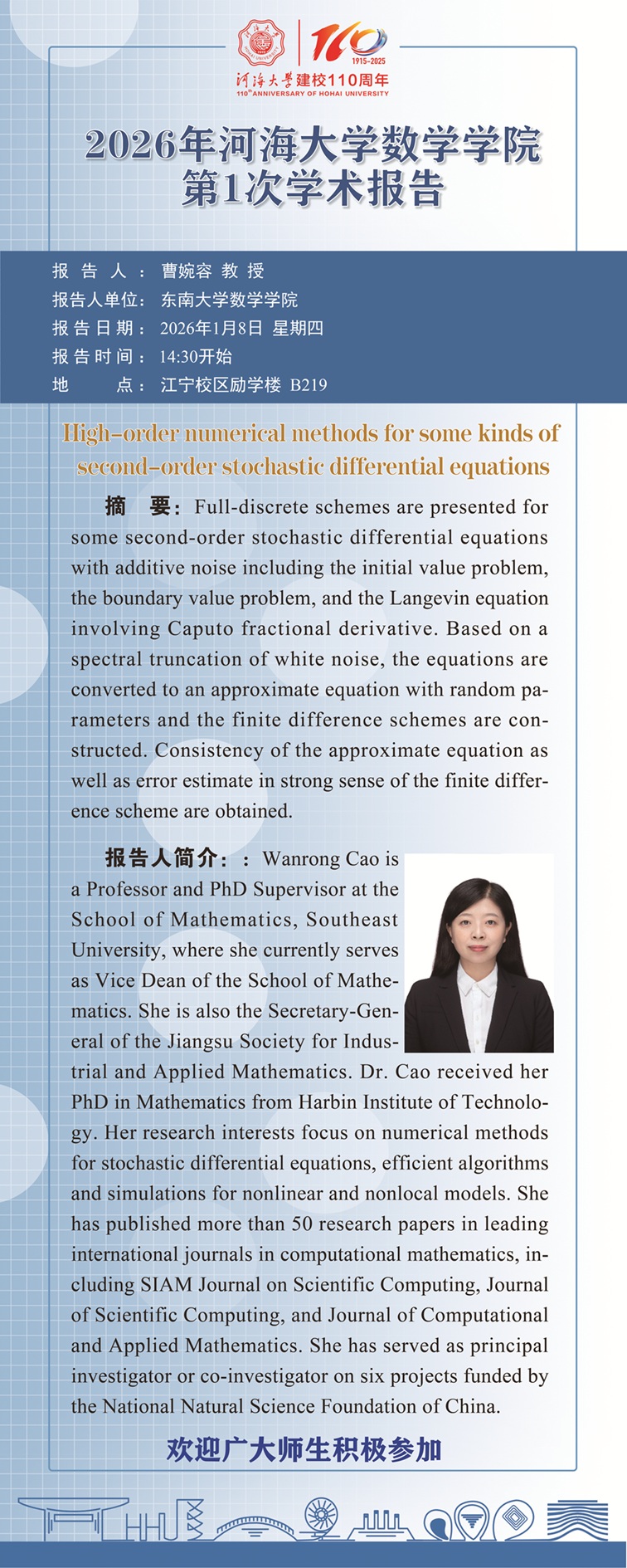77779193永利集团2026年第1次学术报告:High-order numerical methods for some kinds of second-order stochastic differential equations
